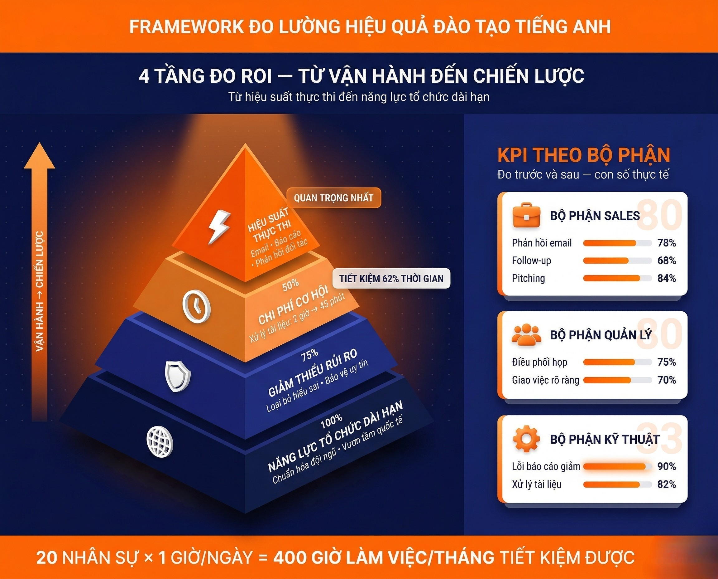Ví dụ: 20 nhân sự tiết kiệm 1 giờ/ngày = 400 giờ làm việc/tháng. Đây là dữ liệu thực tế CEO cần nhìn thấy.