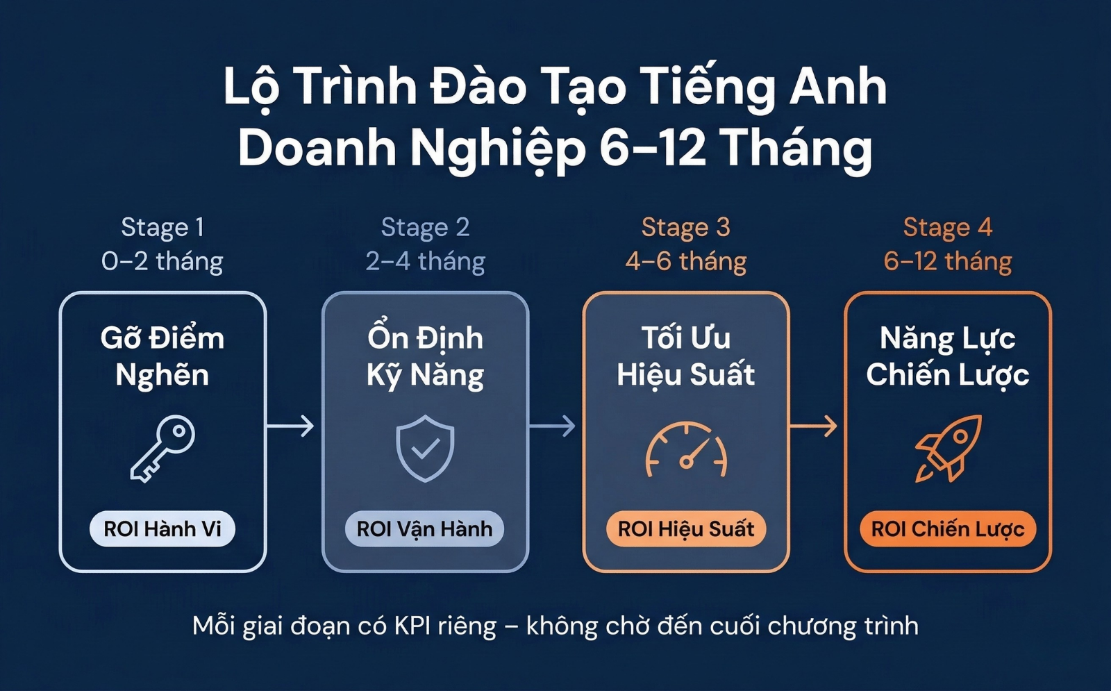 Lộ trình đào tạo tiếng Anh doanh nghiệp 6–12 tháng là kế hoạch triển khai theo từng giai đoạn có mục tiêu, KPI và kết quả cụ thể, nhằm tạo ROI từng bước thay vì chờ đến cuối chương trình.